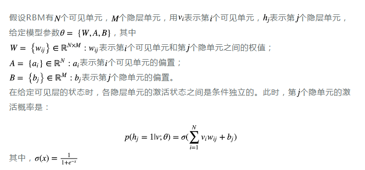 - 每一个可见层节点和隐藏层节点都有两种状态:1(激活状态,on),0(未被激活状态,off)