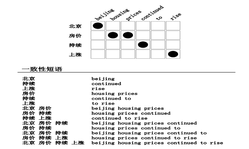 - 抽取14条与词对齐保持一致的短语对(概率估计在短语上进行)