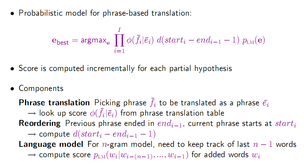 计算最佳的翻译路径 结合语言模型和短语翻译概率得到解码